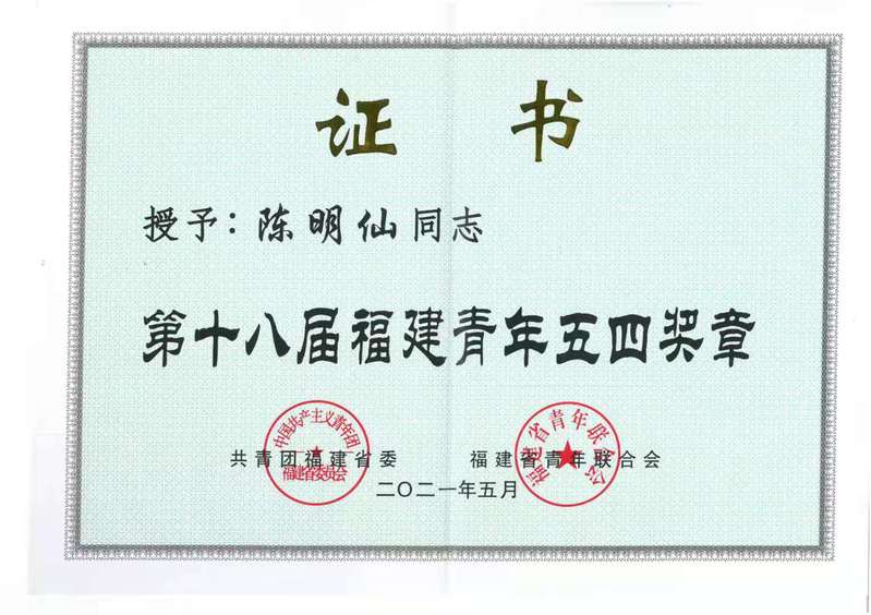 授予陳明仙同志第十八屆“福建青年五四獎章”(青年科教人才)