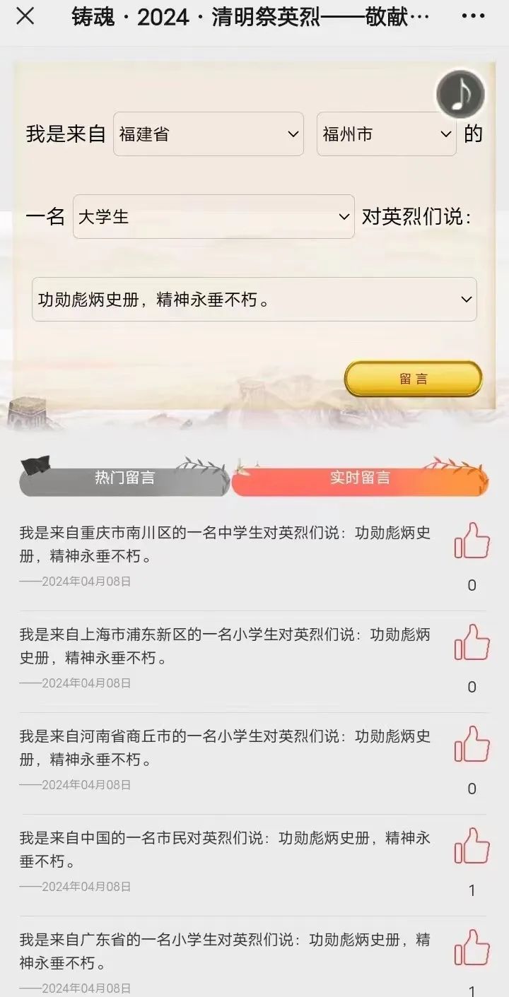 為進一步增進我院廣大學(xué)生繼承和弘揚革命英烈的精神,培養(yǎng)大學(xué)生愛國意識,經(jīng)濟與管理學(xué)院于2024年4月4日開展“祭奠革命英烈,傳承紅色精神”網(wǎng)絡(luò)寄語活動。