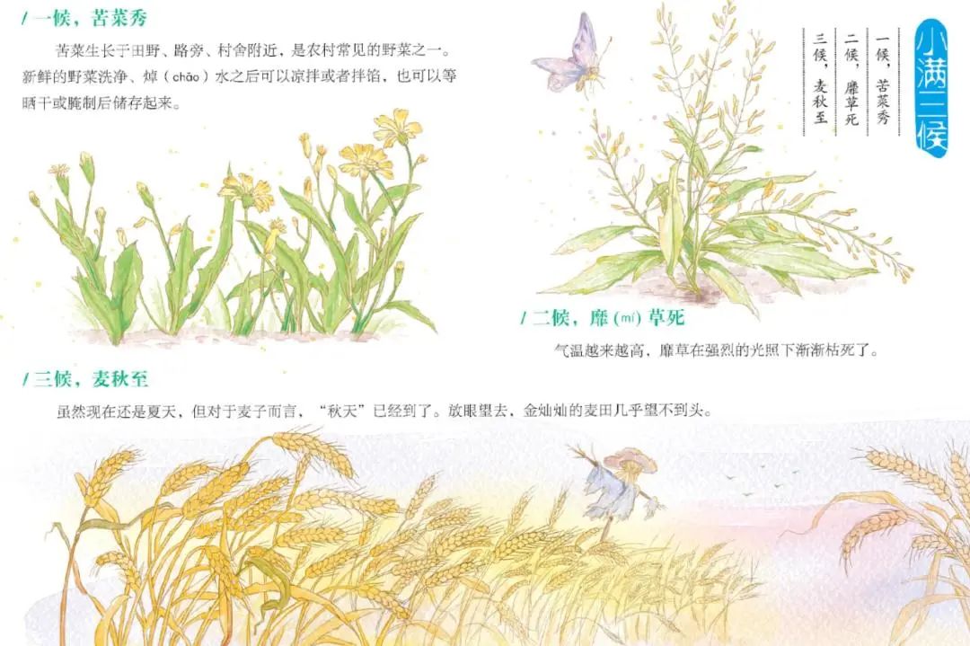 小滿節(jié)氣后,苦菜已經(jīng)枝葉繁茂;之后,喜陰的一些枝條細軟的草類在強烈的陽光下開始枯死;在小滿的最后一個時段,麥子開始成熟。雖然時間還是夏季,但對麥子來說,卻到了成熟的“秋”。