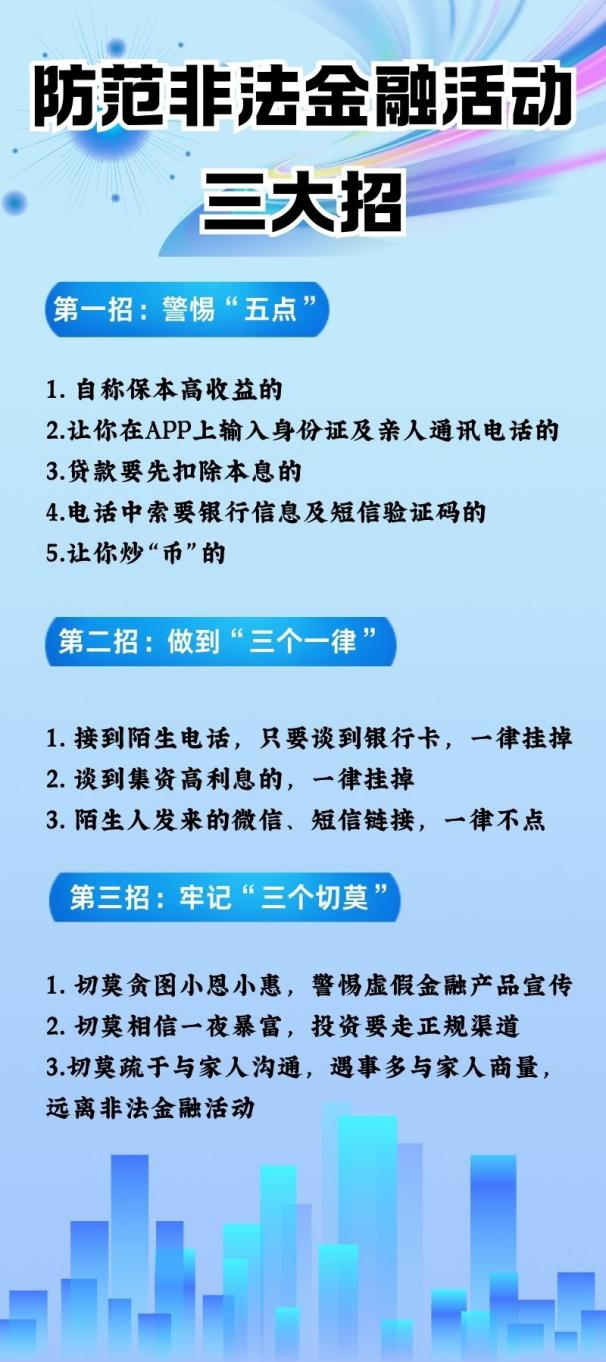 非法金融活動形式和場景多變,但本質(zhì)都是騙取錢財。我們要樹立科學理性的投資觀、消費觀,積極參加普法宣傳,了解金融詐騙特征,通過正規(guī)渠道參與金融活動,切實增強自身風險防范意識和防范能力,守護好自己的“錢袋子”。