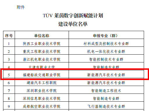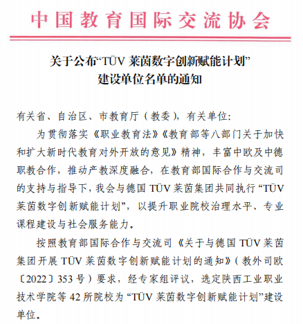 2023年3月14日,中國(guó)教育國(guó)際交流協(xié)會(huì)公布了“TüV萊茵數(shù)字創(chuàng)新賦能計(jì)劃”建設(shè)單位名單。我校成為建設(shè)單位之一,新能源技術(shù)專業(yè)群被確立為建設(shè)專業(yè),在獲批名單內(nèi)排名第五。