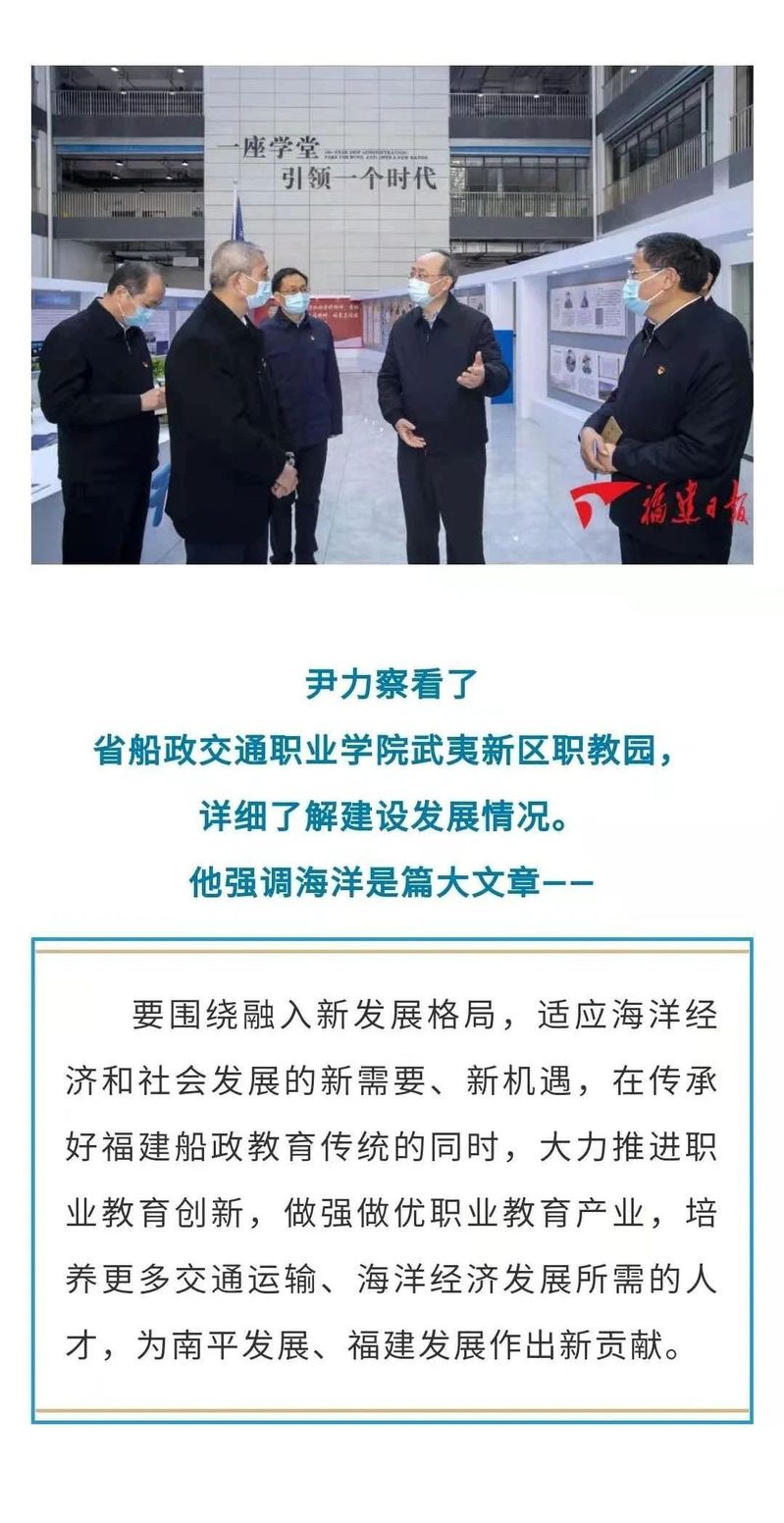福建省委書記尹力察看我院武夷新區(qū)職教園,張海明書記、陳錦輝院長匯報了學(xué)院工作,并陪同看望職教園師生。福建新聞聯(lián)播、福建日報對此進行了相關(guān)報道。