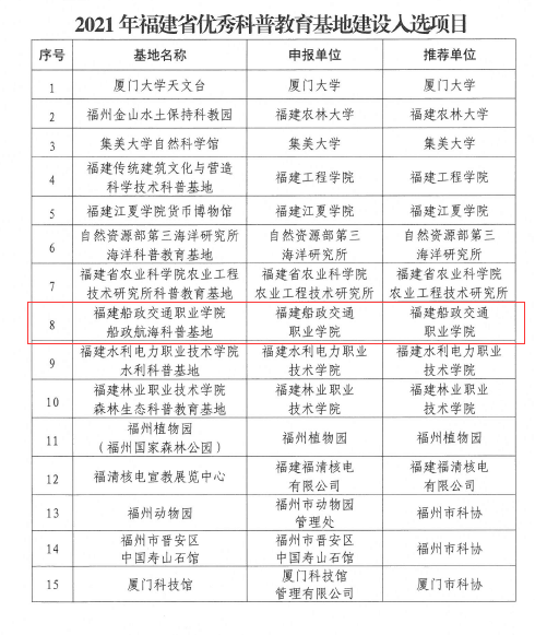 近日,根據福建省科學技術協會下發(fā)的《關于簽訂2021年福建省優(yōu)秀科普教育基地建設項目任務書的函》,我院船政航??破栈爻晒θ脒x2021年“福建優(yōu)秀科普基地”建設項目。