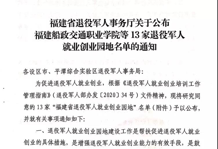 近日,福建省退役軍人事務(wù)廳公布了13家退役軍人就業(yè)創(chuàng)業(yè)園地名單,我院成功入選!