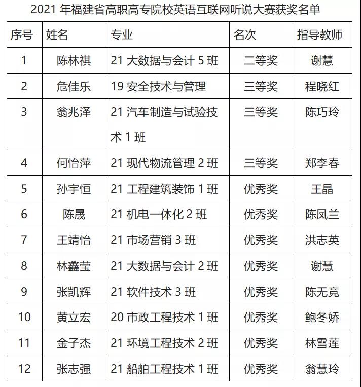 近日,2021年福建省高職高專院校英語互聯(lián)網(wǎng)聽說大賽圓滿結(jié)束,我院取得二等獎1項、三等獎3項、優(yōu)秀獎8項的好成績,并榮獲“優(yōu)秀組織獎”稱號。