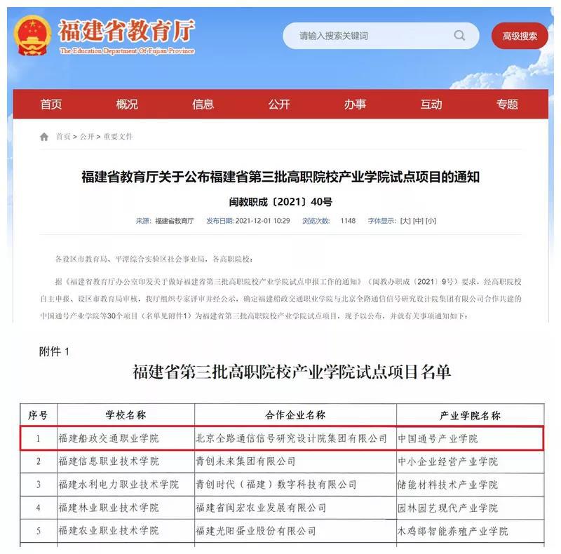 根據(jù)《福建省教育廳關(guān)于公布福建省第三批高職院校產(chǎn)業(yè)學院試點項目的通知》(閩教職成〔2021〕40號),福建船政交通職業(yè)學院與北京全路通信信號研究設(shè)計院集團有限公司合作建立的中國通號產(chǎn)業(yè)學院成功入選福建省第三批高職院校產(chǎn)業(yè)學院試點項目,這是福建船政交通職業(yè)學院堅持立德樹人根本宗旨、落實產(chǎn)教融合創(chuàng)新發(fā)展的重要成果體現(xiàn)。