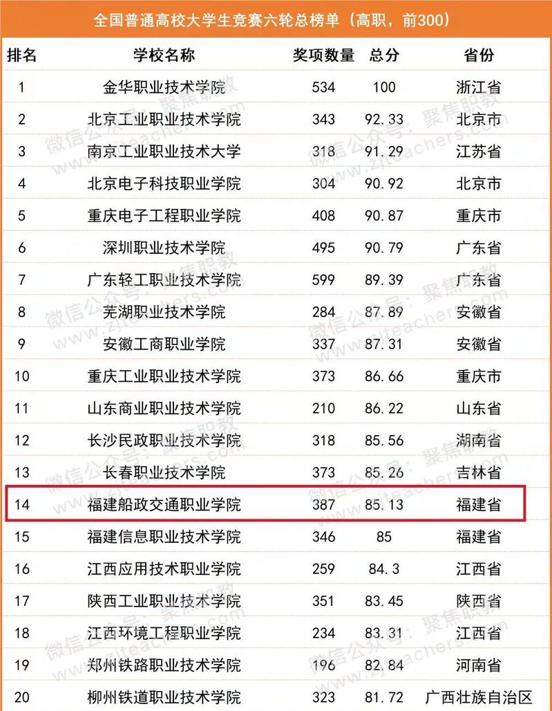 2022年2月22日,中國高等教育學(xué)會高校競賽評估與管理體系研究工作組發(fā)布2021全國普通高校大學(xué)生競賽分析報告,我院排名全國高校大學(xué)生競賽第六輪高職院??偘駟蔚?4,位列福建省排名第一!