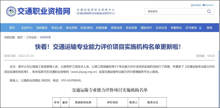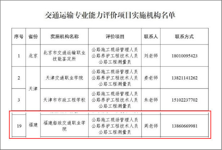 近日,交通運(yùn)輸部職業(yè)資格中心更新了《交通運(yùn)輸專(zhuān)業(yè)能力評(píng)價(jià)項(xiàng)目實(shí)施機(jī)構(gòu)名單》,全國(guó)51家單位獲批,我院榜上有名,包攬公路施工現(xiàn)場(chǎng)管理人員、公路養(yǎng)護(hù)工程技術(shù)人員和公路工程測(cè)量員在內(nèi)的所有評(píng)價(jià)項(xiàng)目的實(shí)施資格。