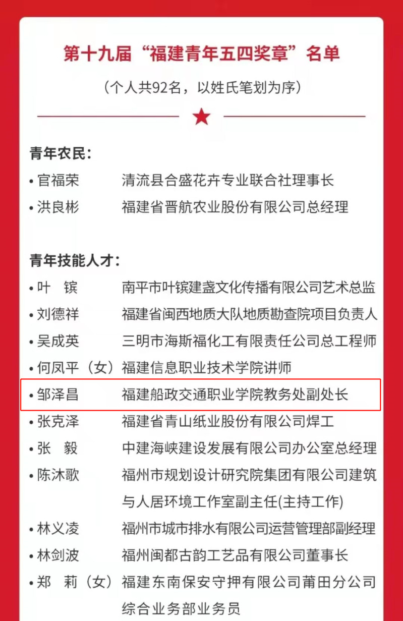 近日,團(tuán)省委在機(jī)關(guān)舉辦2022年福建省五四表彰頒獎(jiǎng)儀式, 對(duì)獲得全國(guó)及福建青年五四獎(jiǎng)?wù)?、“兩紅兩優(yōu)” 進(jìn)行集中表彰。我院教務(wù)處鄒澤昌老師榮獲“福建青年五四獎(jiǎng)?wù)隆狈Q號(hào)表彰。