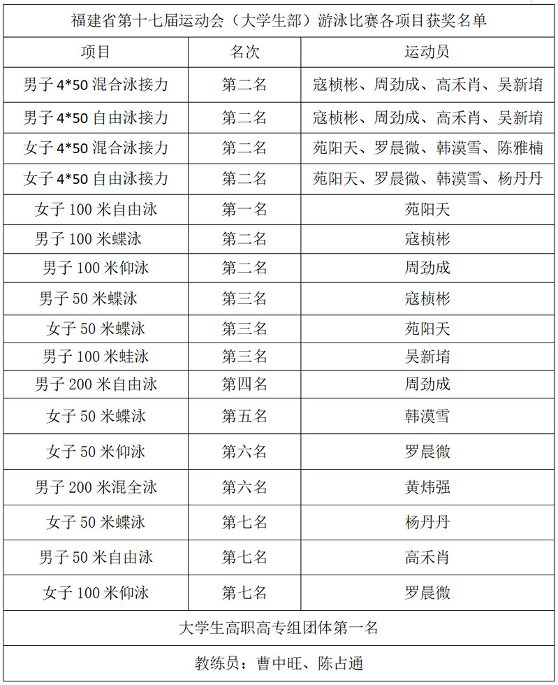 7月27日至30日,由福建省教育廳、福建省體育局主辦的福建省第十七屆運動會(大學(xué)生部)游泳比賽在廈門大學(xué)翔安校區(qū)落下帷幕。經(jīng)過四天激烈角逐,我院代表隊以總分114分的優(yōu)異成績獲得大學(xué)生丙組團體第一名。