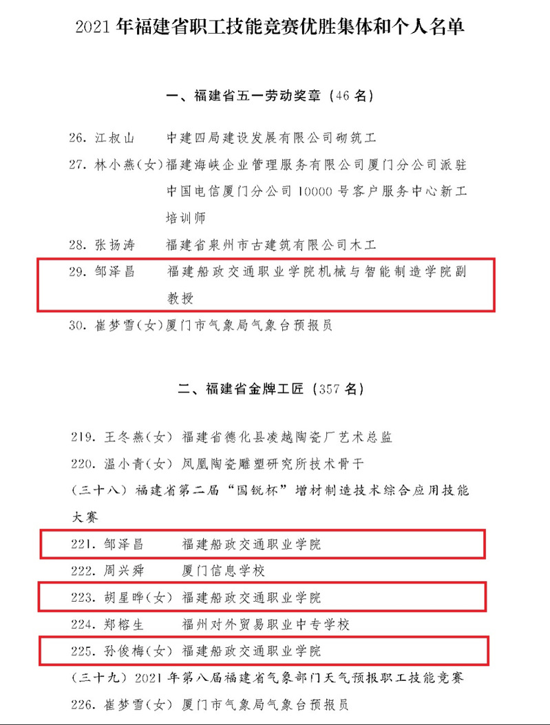 近日,福建省總工會下發(fā)《關(guān)于表彰2021年全省勞動和技能競賽優(yōu)勝集體和個人的決定》(閩工〔2022〕104號),機械與智能制造學院鄒澤昌、胡星曄、孫俊梅榜上有名。鄒澤昌榮獲“福建省五一勞動獎?wù)隆睒s譽稱號,鄒澤昌、胡星曄、孫俊梅榮獲“福建省金牌工匠”榮譽稱號。
