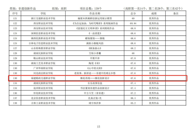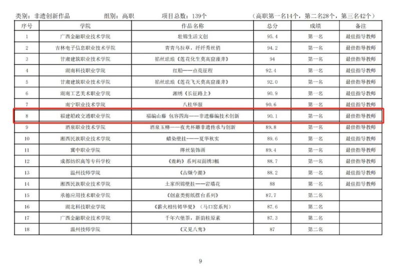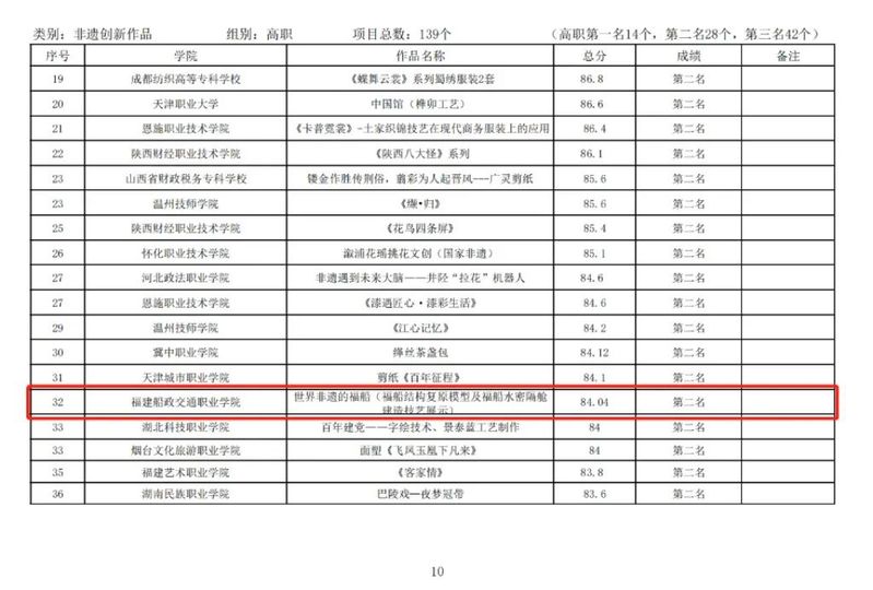 在“非遺創(chuàng)新作品”類目中,我?!陡>幧教?包容四?!沁z藤編技術(shù)創(chuàng)新》獲高職組第一名、最佳指導(dǎo)教師獎;《世界非遺的福船(福船結(jié)構(gòu)復(fù)原模型及福船水密隔艙建造技藝展示)》獲高職組第二名;《時代傘——油紙傘創(chuàng)新作品》獲高職組第三名;《纏花再現(xiàn)——纏花創(chuàng)新設(shè)計》獲高職組優(yōu)秀作品獎。