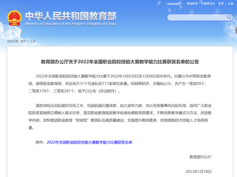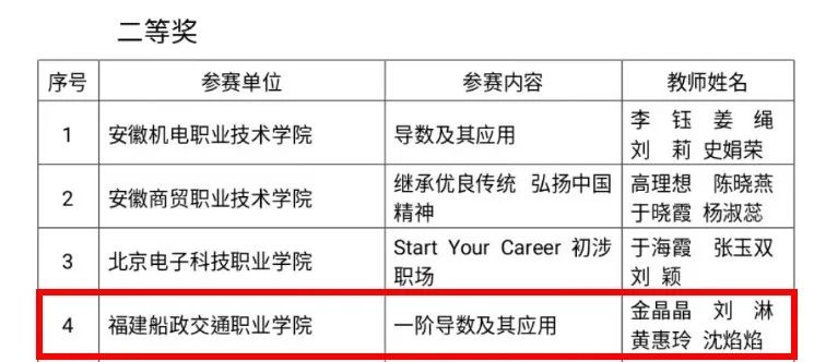 1月18日,教育部辦公廳公布由教育部主辦,代表全國(guó)職業(yè)院校教學(xué)能力最高水平的權(quán)威賽事--2022年全國(guó)職業(yè)院校技能大賽教學(xué)能力比賽獲獎(jiǎng)名單。我校通識(shí)教育學(xué)院金晶晶、劉淋、黃惠玲、沈焰焰教學(xué)團(tuán)隊(duì)的作品《一階導(dǎo)數(shù)及其應(yīng)用》榮獲二等獎(jiǎng)。