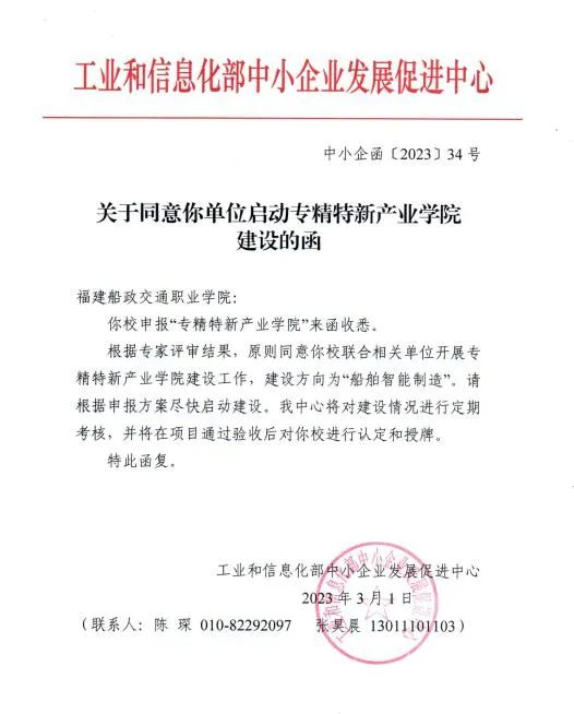 近日,工業(yè)和信息化部中小企業(yè)發(fā)展促進中心公布首批“專精特新產(chǎn)業(yè)學院”啟動建設名單,我校申報“船舶智能制造專精特新產(chǎn)業(yè)學院”經(jīng)過歷時半年的初審、線上考察、專家初評、專家會評等4輪競爭性遴選,最終從800多所高校中脫穎而出成功獲批立項建設。此次“專精特新產(chǎn)業(yè)學院”獲批建設,標志著我校在產(chǎn)教融合校企合作提質(zhì)升級上又邁出了堅實的步伐。“船舶智能制造專精特新產(chǎn)業(yè)學院”依托我校船舶工程技術、輪機工程技術、機械制作及自動化、工業(yè)機器人技術、機電一體化等優(yōu)勢特色專業(yè),立足服務海洋工程與高技術船舶制造強國重點領域,與中船船舶設計技術國家工程研究中心有限公司(上海市經(jīng)信委2021年度專精特新企業(yè))、福建興航重工有限公司(工信部第四批專精特新小巨人企業(yè))、福建福船一帆新能源裝備制造有限公司(福建省工信廳2021年度專精特新中小企業(yè))、福建省威諾數(shù)控有限公司(福建省工信廳2022年度專精特新中小企業(yè))、上海船舶工程質(zhì)量檢測公司(上海市經(jīng)信委2021年度專精特新企業(yè))、福建省立新船舶工程有限公司、福建省船舶行業(yè)協(xié)會等單位聯(lián)合申報共建。接下來,學校將圍繞“專精特新產(chǎn)業(yè)學院”建設任務,進一步完善產(chǎn)學研合作機制和資源共建共享機制,不斷深化產(chǎn)教融合和人才培養(yǎng)供供給側結構性改革,促進教育鏈、人才鏈與產(chǎn)業(yè)鏈、創(chuàng)新鏈的有機銜接,著力打造產(chǎn)教融合創(chuàng)新發(fā)展載體,培養(yǎng)適應產(chǎn)業(yè)需求的高質(zhì)量技術技能人才。