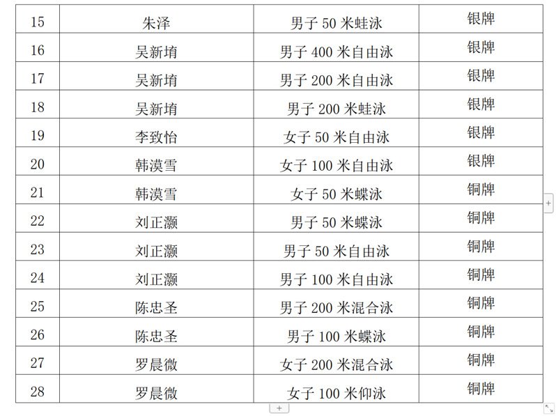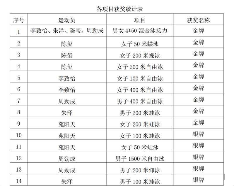 6月22日-25日,2023年福建省大學(xué)生游泳錦標賽在福建省龍巖市連城縣成功舉辦。本次賽事分為甲、乙、丙、丁四個組別,我校共派出10名游泳隊員參加丙組比賽(高職高專院校),斬獲9金11銀8銅,取得團體總分第一名的佳績。
