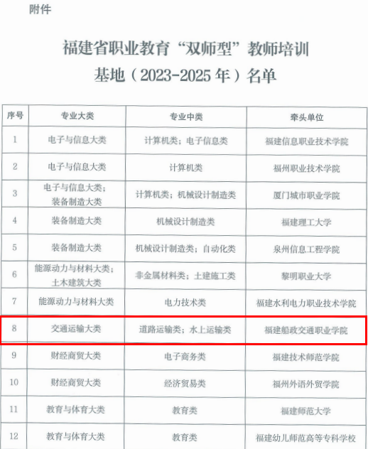7月12日,福建省教育廳印發(fā)《關(guān)于公布省級職業(yè)教育“雙師型”教師培訓基地(2023-2025年)的通知》,我校獲批福建省職業(yè)教育“雙師型”教師培訓基地(2023-2025年),開展交通運輸大類道路運輸類、水上運輸類的“雙師型”教師培訓與實踐。福建省職業(yè)教育“雙師型”教師培訓基地是我省職業(yè)院校教師發(fā)展體系的重要組成部分,是承擔省級及以上職業(yè)院校教師素質(zhì)提高計劃培訓任務(wù)的重要載體。