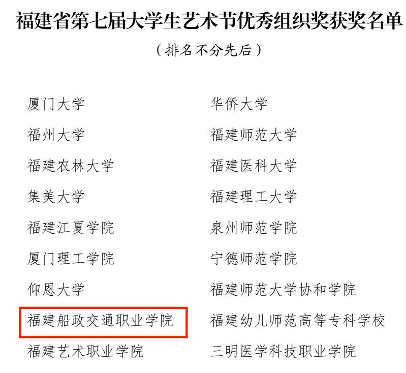 福建省第七屆大學(xué)生藝術(shù)節(jié)展演活動獲獎名單近日公布。大藝展由福建省教育廳主辦,三年舉辦一次,本屆藝術(shù)節(jié)以“厚植家國情懷,涵養(yǎng)進取品格”為主題。我院精心準備,選送了4個項目參加福建省第七屆大學(xué)生藝術(shù)節(jié)展演,斬獲6項榮譽,其中一等獎1項并入圍國賽角逐,二等獎2項,三等獎1項,學(xué)院榮獲優(yōu)秀組織獎,1位學(xué)生獲個人專項獎。