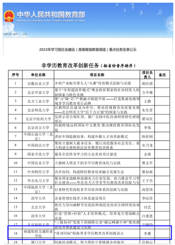 近日,教育部發(fā)布了《2023年學(xué)習(xí)型社會(huì)建設(shè)(高等繼續(xù)教育領(lǐng)域)重點(diǎn)任務(wù)名單》,全國(guó)共有100項(xiàng)學(xué)歷繼續(xù)教育教學(xué)改革創(chuàng)新任務(wù)、100項(xiàng)非學(xué)歷教育改革創(chuàng)新任務(wù)、50項(xiàng)探索三教統(tǒng)籌協(xié)同創(chuàng)新路徑任務(wù)入圍培育建設(shè)名單。由我院航海學(xué)院申報(bào)的《“育訓(xùn)同標(biāo)”船海類非學(xué)歷教育改革創(chuàng)新試點(diǎn)》成功入選非學(xué)歷教育教學(xué)改革創(chuàng)新項(xiàng)目,并作為典型案例在2024年全民終身學(xué)習(xí)活動(dòng)周全國(guó)總開幕式上展出。