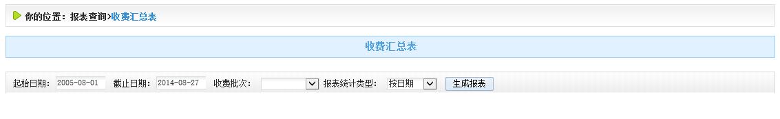 選擇需要生成報(bào)表的時(shí)間段、收費(fèi)批次以及需要生成的統(tǒng)計(jì)類型,點(diǎn)擊生成報(bào)表按鈕。如圖4.4.3-2、4.4-3所示: