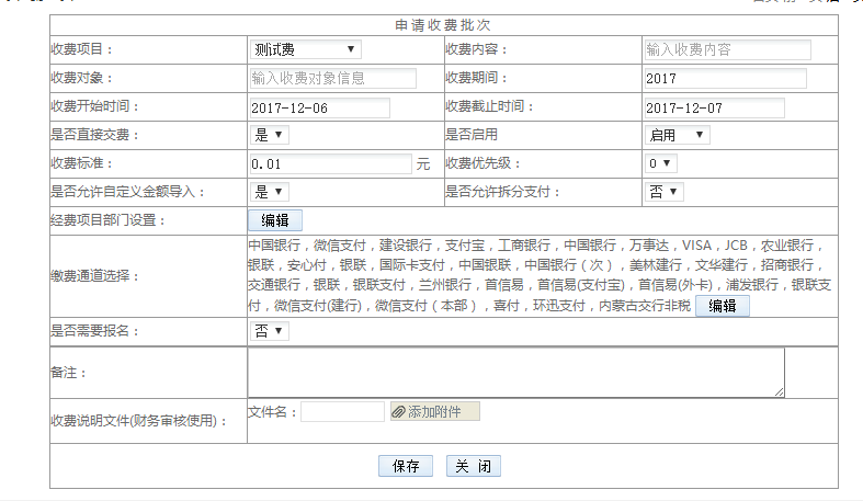 3)收費(fèi)開(kāi)始、截止時(shí)間:定義收費(fèi)起止時(shí)間,學(xué)生只能在該期間內(nèi)繳費(fèi)。