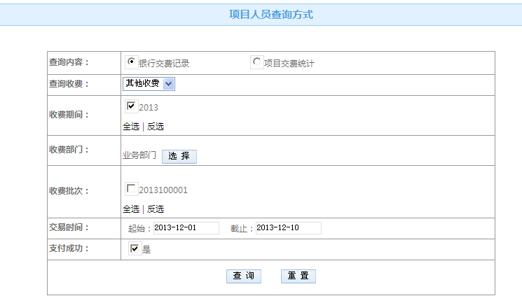 選擇收費(fèi)項(xiàng)目,輸入人員姓名、編號(hào)、身份證號(hào)以及支付狀態(tài),點(diǎn)擊 按鈕查詢具體的繳費(fèi)人員信息。