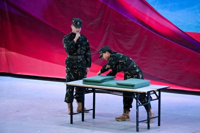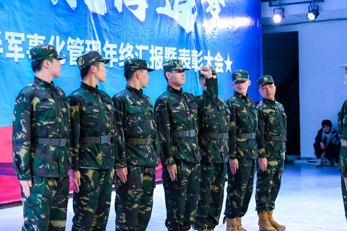 隨后的成果匯報(bào)展演環(huán)節(jié),直觀展現(xiàn)了半軍事化管理的扎實(shí)成效。隊(duì)列操《鐵血軍魂》中,身著統(tǒng)一迷彩的學(xué)子步伐鏗鏘、動(dòng)作整齊,嘹亮口號(hào)響徹全場(chǎng),盡顯令行禁止的優(yōu)良作風(fēng);內(nèi)務(wù)展示《疊被子》現(xiàn)場(chǎng),展演同學(xué)手法嫻熟,鋪平、壓實(shí)、折疊、修形一氣呵成,棱角分明的“豆腐塊”,彰顯出半軍事化管理對(duì)細(xì)節(jié)的嚴(yán)格要求;半軍管情景劇,串聯(lián)起升旗儀式、晚熄燈、夜間訓(xùn)練、早列隊(duì)、主題班會(huì)等半軍事化管理日常場(chǎng)景,展現(xiàn)新生從抗拒半軍管的約束,到理解其背后的深意,再到傳承這份航海人的精神底色。詩朗誦《紀(jì)律鑄魂 青春礪劍—致半軍管歲月的赤誠與擔(dān)當(dāng)》,抒發(fā)了航海青年對(duì)規(guī)則的敬畏、對(duì)集體的熱愛;大合唱《如愿》將現(xiàn)場(chǎng)氛圍推向小高潮,歌聲里飽含著學(xué)子們接續(xù)奮斗、逐夢(mèng)深藍(lán)的堅(jiān)定信念。