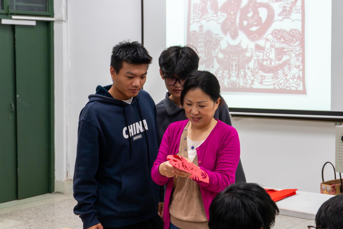 進入實踐創(chuàng)作環(huán)節(jié),董老師親自示范指導,耐心解答學生們的疑問。同學們熱情高漲、踴躍參與,紅紙在指尖翻飛,剪刀在紙上流轉,一個個獨具巧思的圖案逐漸成型。