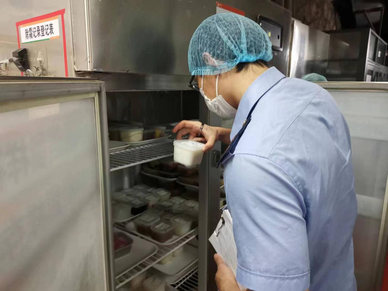 檢查組一行全面檢查了食堂疫情防控管理、食品進(jìn)貨臺賬、員工健康管理、食品留樣、原料控制、加工制作過程、備餐供餐與配送、場所和設(shè)備設(shè)施清潔維護(hù)、餐飲具清洗消毒等。針對檢查發(fā)現(xiàn)的問題,要求立行立改。