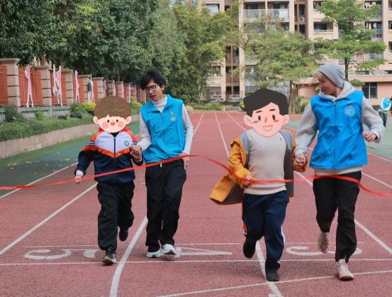 活動中,志愿者分工協(xié)作,提供全程引導與陪伴。有的提前熟悉賽道,用清晰口令指引方向;有的協(xié)助完成檢錄、熱身等準備工作;有的在終點及時提供攙扶與補給,保障了比賽安全有序進行。盲校學生在賽場上奮勇爭先,志愿者則始終陪伴在側,通過語言鼓勵和實際協(xié)助,與他們共同感受運動的激情與喜悅。