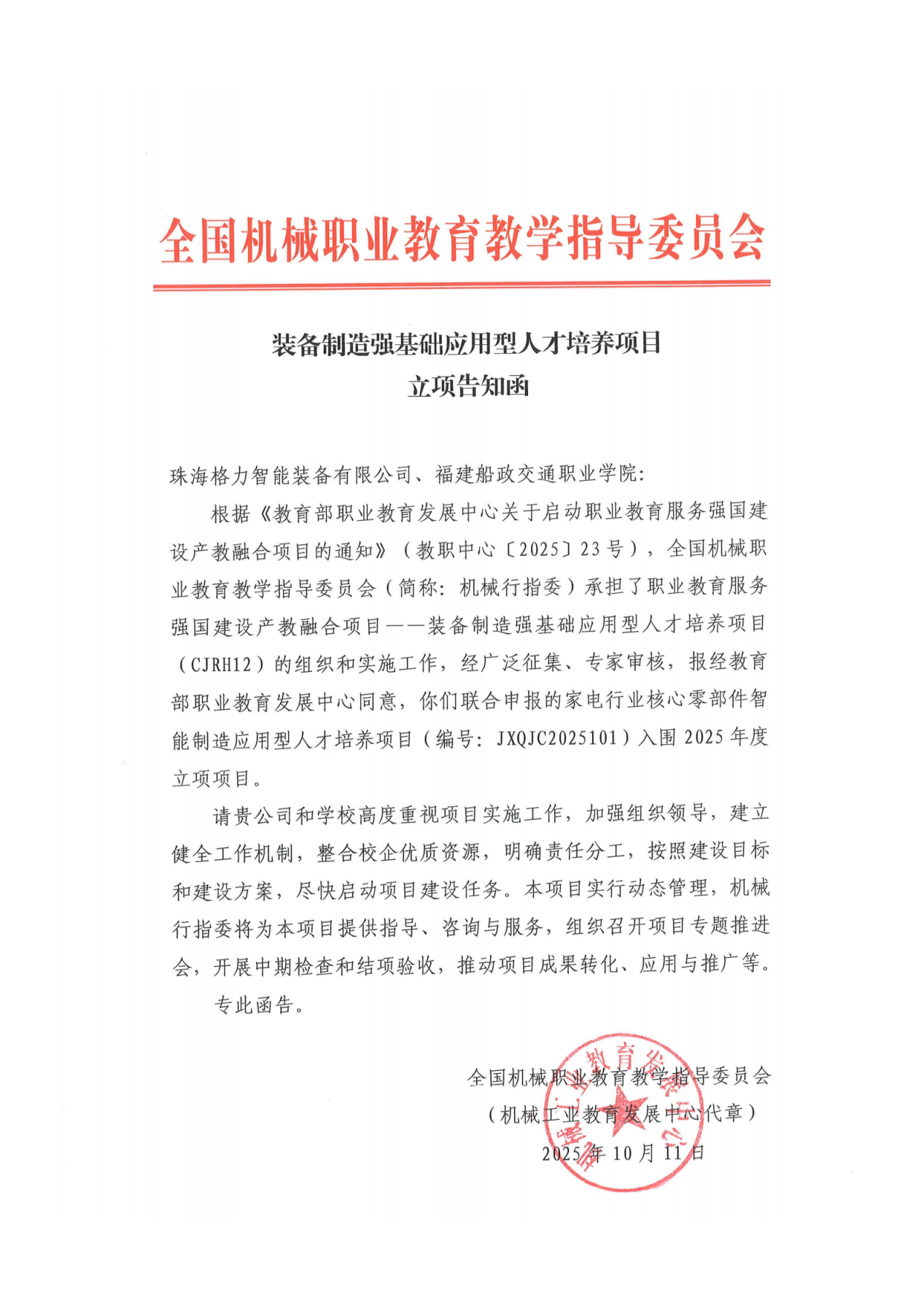 近日,全國機械職業(yè)教育教學(xué)指導(dǎo)委員會發(fā)布通知,我院聯(lián)合珠海格力智能裝備有限公司共同申報的“家電行業(yè)核心零部件智能制造應(yīng)用型人才培養(yǎng)項目”入選職業(yè)教育服務(wù)強國建設(shè)產(chǎn)教融合項目--裝備制造強基礎(chǔ)應(yīng)用型人才培養(yǎng)項目。