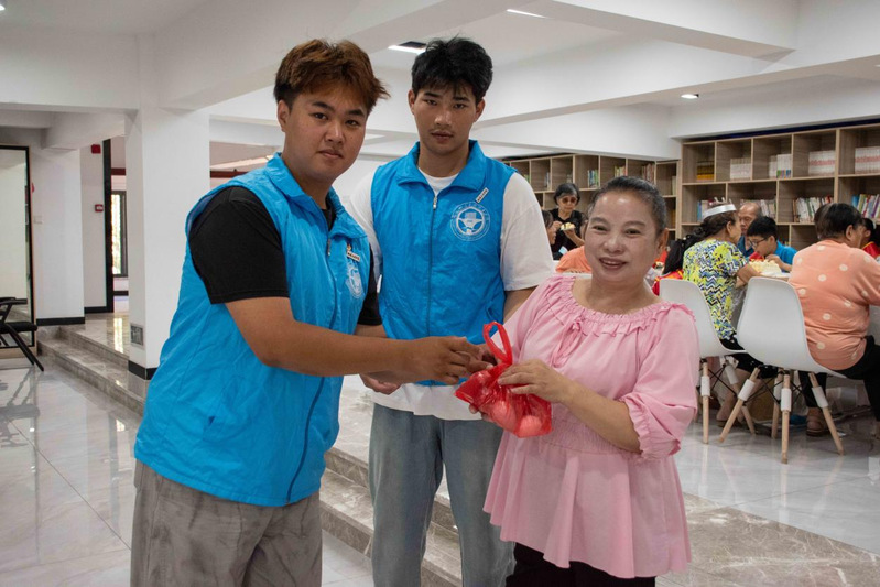 活動(dòng)接近尾聲,志愿者們將愛心禮物一一送到老人手中。禮物雖不貴重,卻飽含心意。學(xué)生們俯身與老人交談,傾聽他們的故事,擁抱告別。