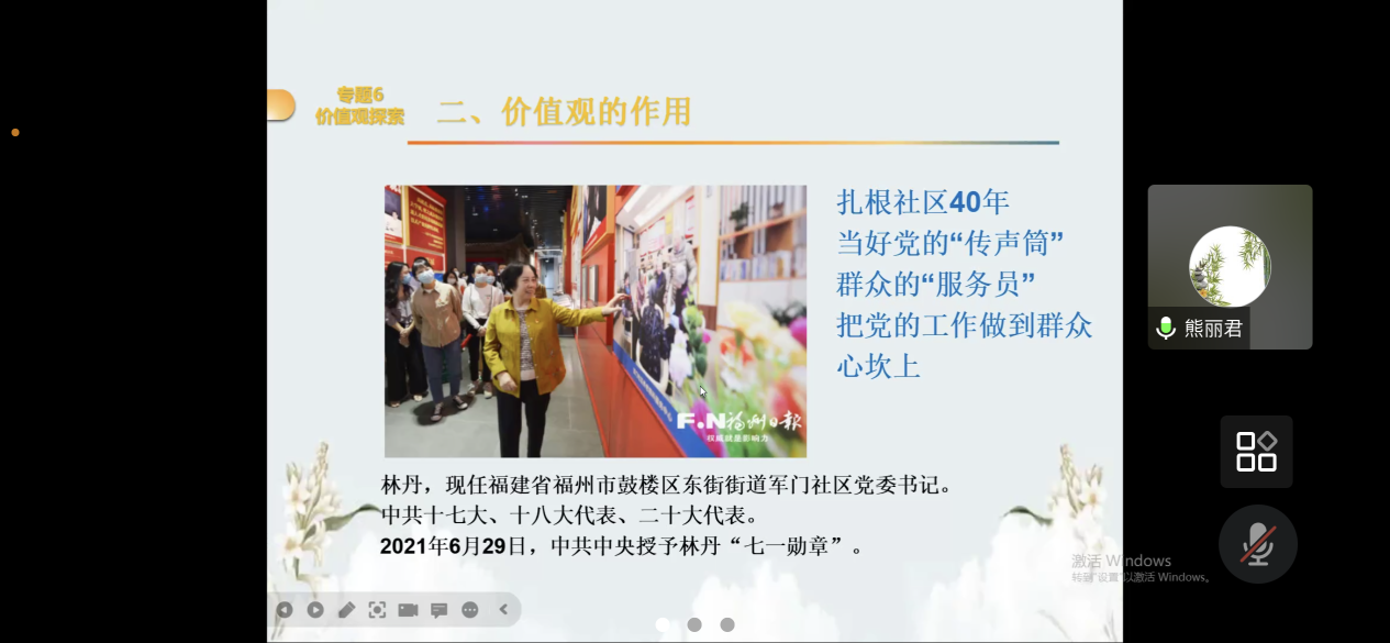 在片斷教學(xué)展示中,熊麗君老師就圍繞價(jià)值觀的內(nèi)涵、價(jià)值觀的作用兩個(gè)知識(shí)點(diǎn)進(jìn)行了片段教學(xué),通過“七一勛章”獲得者林丹、張桂梅兩個(gè)人物故事,生動(dòng)闡釋了價(jià)值觀對(duì)于個(gè)人職業(yè)生涯的影響。