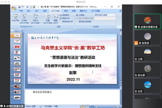 11月2日,馬克思主義學(xué)院思想道德與法治教研室開展了“優(yōu)·美”教學(xué)工作坊線上集體備課活動。本次教研活動圍繞《思想道德與法治》第二章《追求遠(yuǎn)大理想堅定崇高信念》第一節(jié)《理想信念的內(nèi)涵及重要性》展開。此次教研活動由陳雨清老師擔(dān)任主講,趙黎老師進行無聲片段教學(xué)展示。德法教研室全體專任教師和部分校內(nèi)兼任教師老師參加了此次活動。
