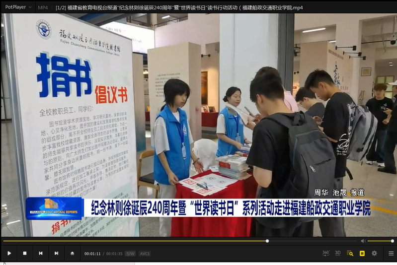 福建教育電視臺報道福建船政交通職業(yè)學(xué)院第十五屆讀書文化節(jié) “紀(jì)念林則徐誕辰 240 周年” 暨“世界讀書日”讀書行動系列活動之圖書捐贈活動