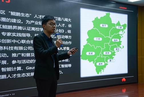 會議開始信息與智慧交通學(xué)院書記許友孝發(fā)表講話,對到會同學(xué)提出熱切希望,他希望同學(xué)們能夠通過本次鯤鵬人才生態(tài)八閩高校行宣講會加深對自己所學(xué)專業(yè)的認識,進一步熟悉行業(yè)發(fā)展情況,為將來就業(yè)打下堅實基礎(chǔ),為信息技術(shù)應(yīng)用創(chuàng)新產(chǎn)業(yè)添磚加瓦。