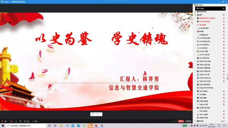 2021年5月30日,信息與智慧交通學(xué)院開(kāi)展了第二期“學(xué)黨史,強(qiáng)信念,跟黨走”2018級(jí)預(yù)備黨員線上黨史學(xué)習(xí)心得交流會(huì)。本次線上交流會(huì)共有40位預(yù)備黨員參與,第二黨支部書(shū)記潘倩瀅老師與各位學(xué)生黨員進(jìn)行交流與探討。