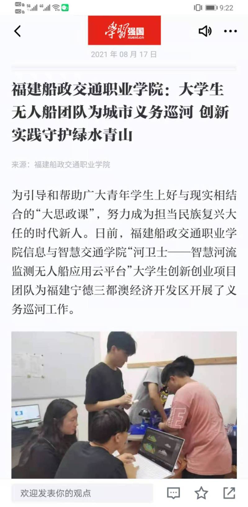 為引導(dǎo)和幫助廣大青年學(xué)生上好與現(xiàn)實(shí)相結(jié)合的“大思政課”,努力成為擔(dān)當(dāng)民族復(fù)興大任的時(shí)代新人。日前,福建船政交通職業(yè)學(xué)院信息與智慧交通學(xué)院“河衛(wèi)士——智慧河流監(jiān)測(cè)無人船應(yīng)用云平臺(tái)”大學(xué)生創(chuàng)新創(chuàng)業(yè)項(xiàng)目團(tuán)隊(duì)為福建寧德三都澳經(jīng)濟(jì)開發(fā)區(qū)開展了義務(wù)巡河工作。