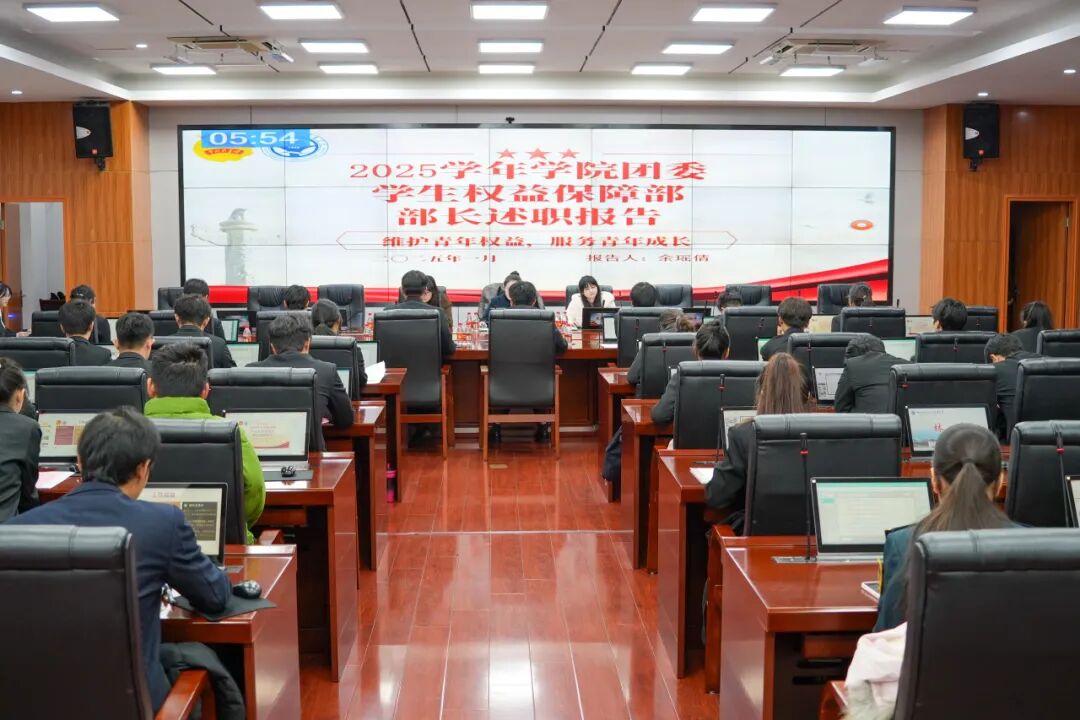 1月11日上午,學(xué)院團(tuán)委2025年度校級(jí)學(xué)生組織述職評(píng)議會(huì)議在福道園行政樓六樓會(huì)議室舉行。學(xué)院團(tuán)委書記陳慧、團(tuán)委學(xué)生社團(tuán)管理部部長(zhǎng)湯曉玲,學(xué)院學(xué)生組織負(fù)責(zé)人參加會(huì)議。會(huì)議由學(xué)院團(tuán)委學(xué)生兼職副書記劉濱福主持。